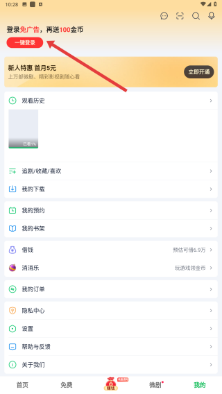 2、我的頁(yè)面,點(diǎn)擊一鍵登錄,進(jìn)行登錄操作,登錄后可享受免廣告等權(quán)益,還能領(lǐng)取金幣。