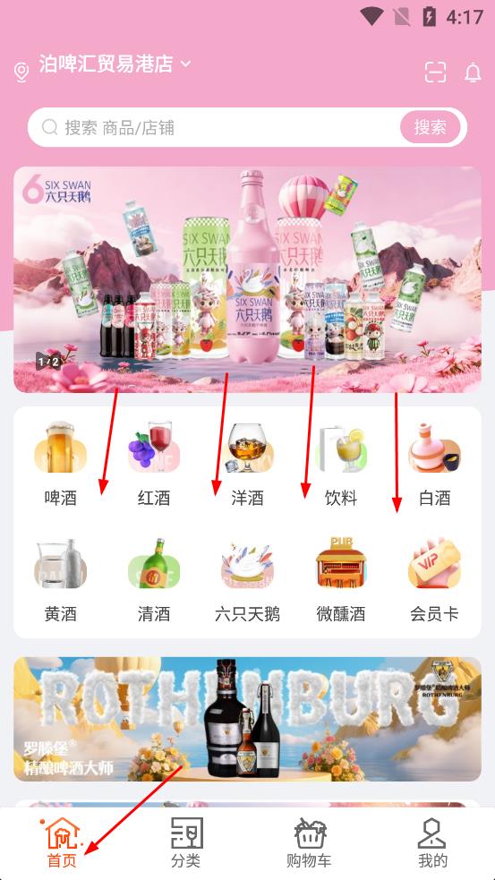 1、首頁選啤酒紅酒等分類找心儀酒類,利用搜索快速定位商品,瀏覽banner了解品牌活動。