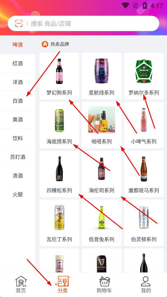 2、分類頁按類別篩選,啤酒類關注熱賣品牌系列,精準查找想購買的酒類商品進行選購。