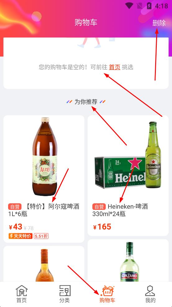 3、購物車查看商品,空車時參考為你推薦選酒,按需刪除商品,完成采購整理購物車。