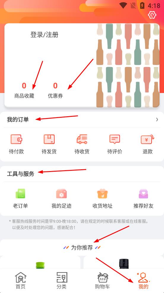 4、我的頁管理訂單,查看商品收藏優(yōu)惠券,用工具與服務查足跡地址,借助推薦發(fā)現好酒。