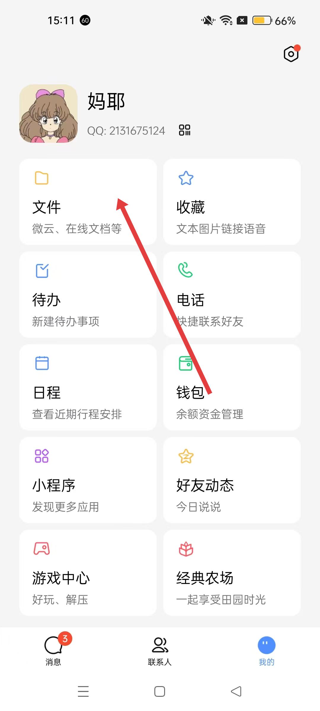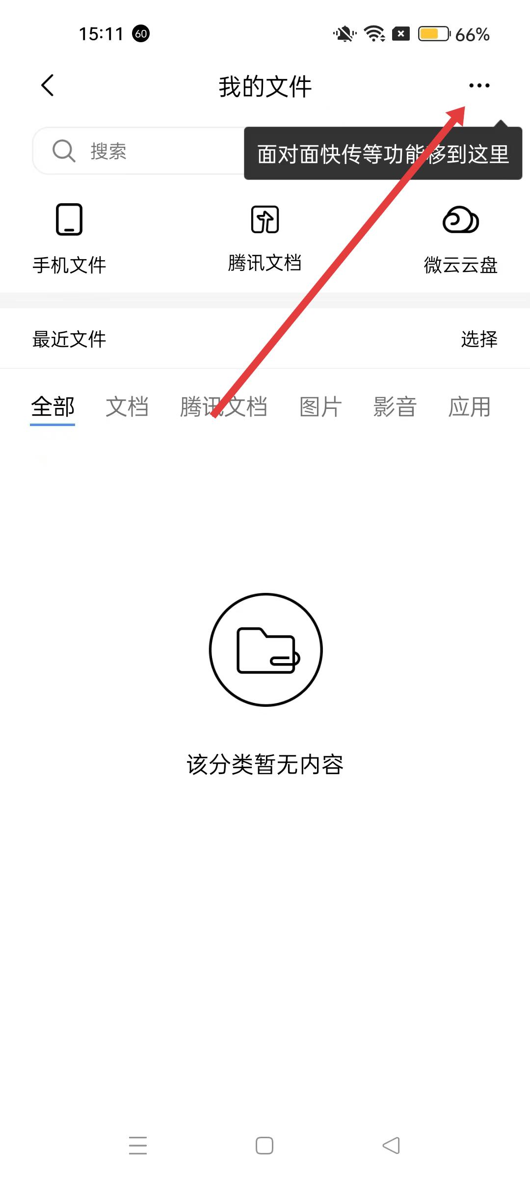 2、個(gè)人中心頁(yè)面點(diǎn)擊文件選項(xiàng),進(jìn)入我的文件頁(yè)面,能查看手機(jī)文件、騰訊文檔、微云云盤(pán)等分類文件。