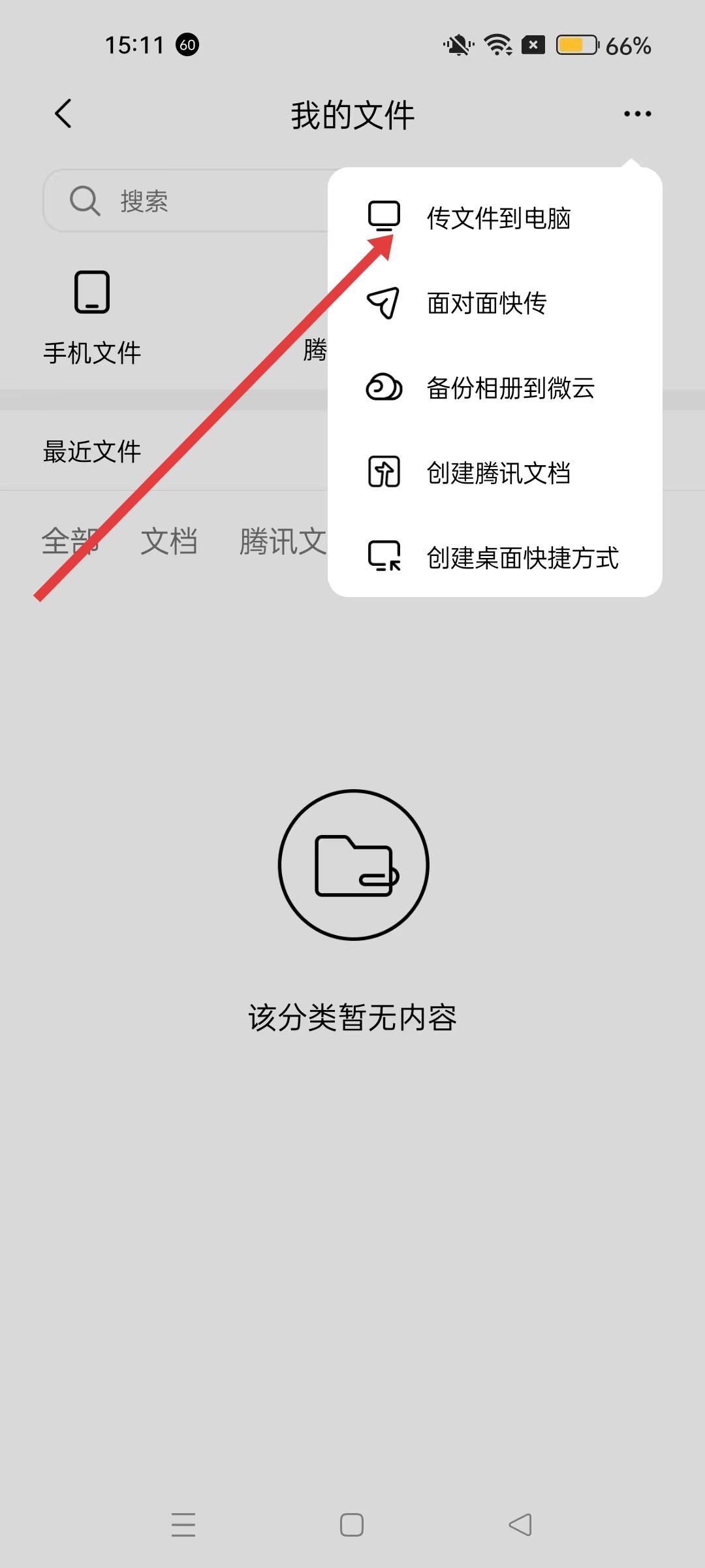 3、我的文件頁(yè)面點(diǎn)擊右上角三點(diǎn)按鈕,彈出功能菜單,可選擇傳文件到電腦、面對(duì)面快傳等操作。