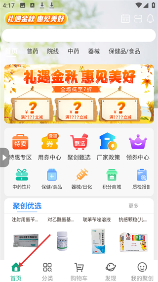 1、首頁(yè)禮遇金秋惠見(jiàn)美好活動(dòng)醒目,設(shè)特賣、用券中心等功能區(qū),展示聚創(chuàng)優(yōu)選藥品方便用戶選購(gòu)。