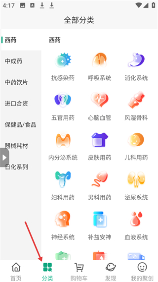 2、全部分類頁(yè)分類豐富,涵蓋西藥、中成藥等,細(xì)化出抗感染藥、呼吸系統(tǒng)等類別助力精準(zhǔn)找藥。