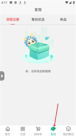 3、發(fā)現(xiàn)頁(yè)有瀏覽記錄、聚創(chuàng)優(yōu)選、新品板塊,當(dāng)前無(wú)商品數(shù)據(jù),可后續(xù)查看相關(guān)內(nèi)容。