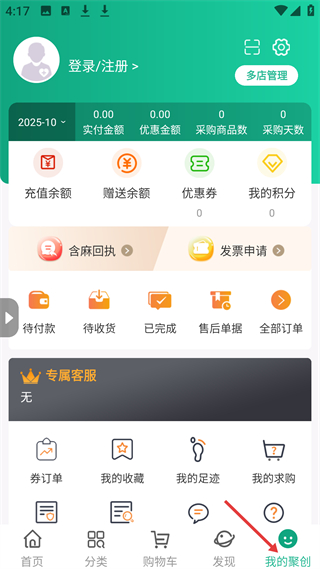 4、我的聚創(chuàng)頁(yè)可登錄注冊(cè),展示實(shí)付金額等采購(gòu)數(shù)據(jù),還有充值余額、訂單管理等實(shí)用功能。