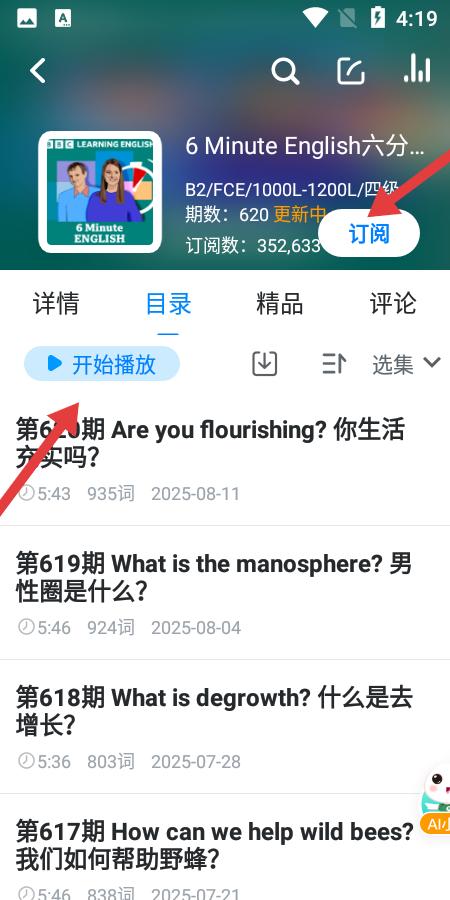 3、6Minute English詳情頁(yè)功能明確,訂閱按鈕與開(kāi)始播放鍵突出,節(jié)目列表按期數(shù)排列,主題與時(shí)長(zhǎng)標(biāo)注,助力用戶通過(guò)趣味英語(yǔ)節(jié)目提升聽(tīng)力水平。