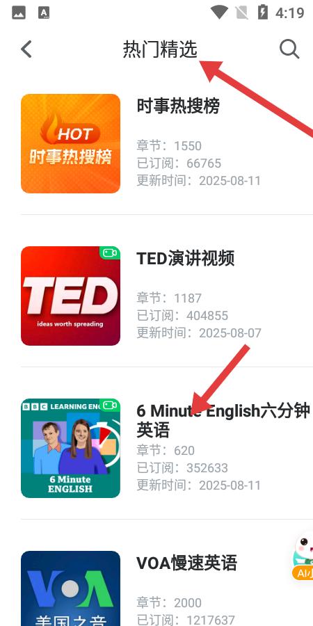 2、熱門精選頁(yè)資源豐富時(shí)事熱搜榜、TED演講等分類展示,6Minute English等節(jié)目羅列,訂閱數(shù)與更新時(shí)間標(biāo)注,方便用戶篩選優(yōu)質(zhì)英語(yǔ)學(xué)習(xí)資源。