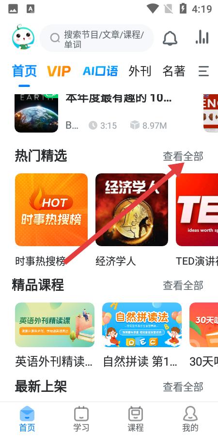 1、熱門精選板塊陳列時(shí)事熱搜榜等資源,查看全部按鈕醒目,引導(dǎo)用戶探索更多英語(yǔ)學(xué)習(xí)內(nèi)容,從熱門中發(fā)現(xiàn)適合自己的學(xué)習(xí)素材。