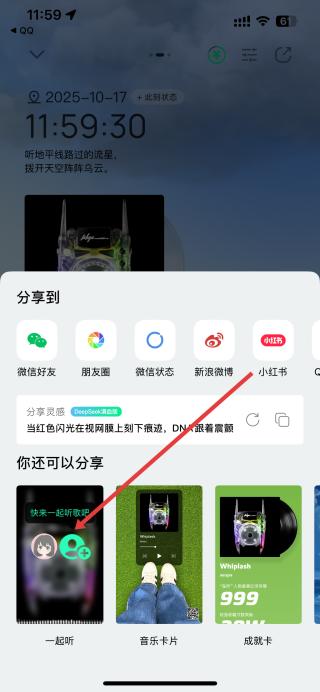 4、選擇想要分享的渠道,比如小紅書,點擊后即可將歌曲分享出去,也可選擇一起聽、音樂卡片等形式分享。