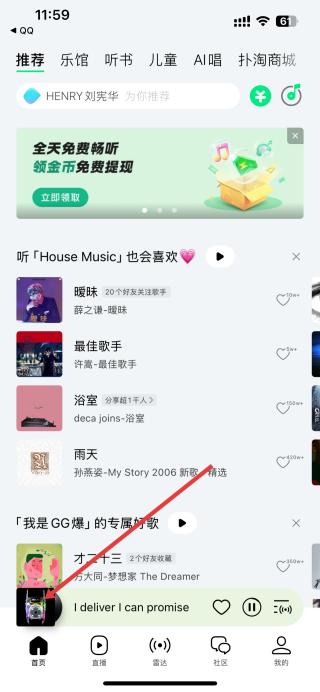 1、打開QQ音樂,進入首頁能看到推薦的歌曲列表,找到想聽的歌曲并點擊,進入歌曲播放頁面。