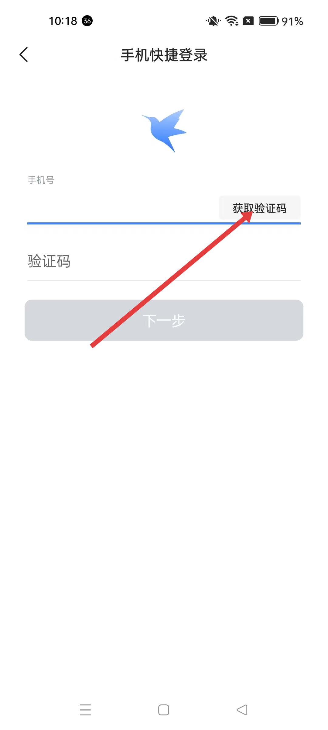 4、手機快捷登錄頁面,輸入手機號后點擊獲取驗證碼,然后輸入驗證碼并點擊下一步,即可完成登錄。