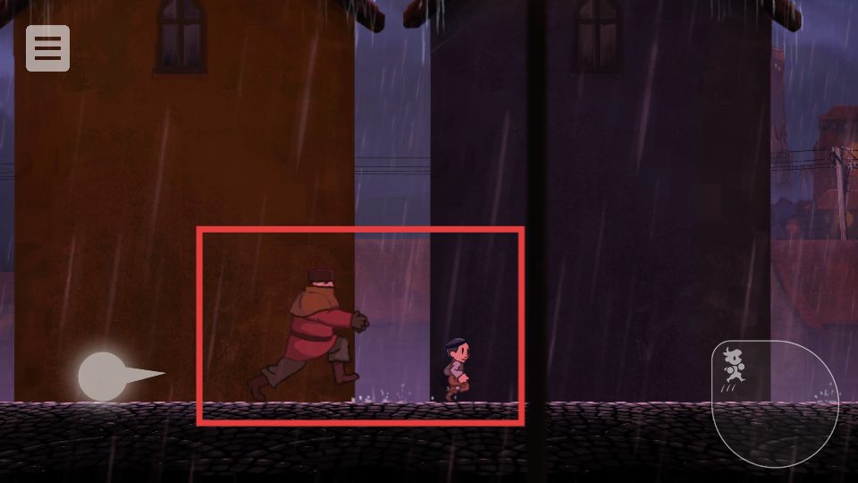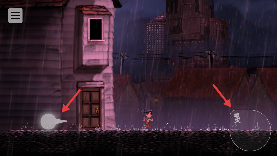 2、進入雨天的城鎮(zhèn)場景中,玩家可以操控角色移動,同時留意右側(cè)的操作區(qū)域,角色可以進行跳躍互動,根據(jù)提示進行操作推進劇情。