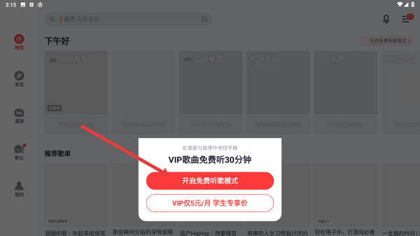 3、進入應(yīng)用主界面,可能會彈出VIP歌曲免費聽30分鐘的提示,可選擇開啟免費聽歌模式,也可了解VIP會員相關(guān)信息。