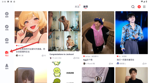 4、應(yīng)用主界面,有推薦、發(fā)現(xiàn)等板塊,還有筆記功能入口,可瀏覽推薦的音樂相關(guān)內(nèi)容,也能查看筆記等。