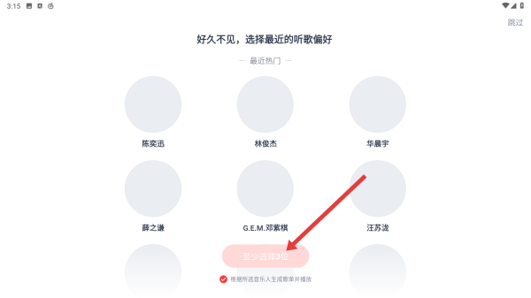 2、登錄后,進入選擇聽歌偏好頁面,可選擇喜歡的歌手,至少選擇3位,選好后進行下一步。
