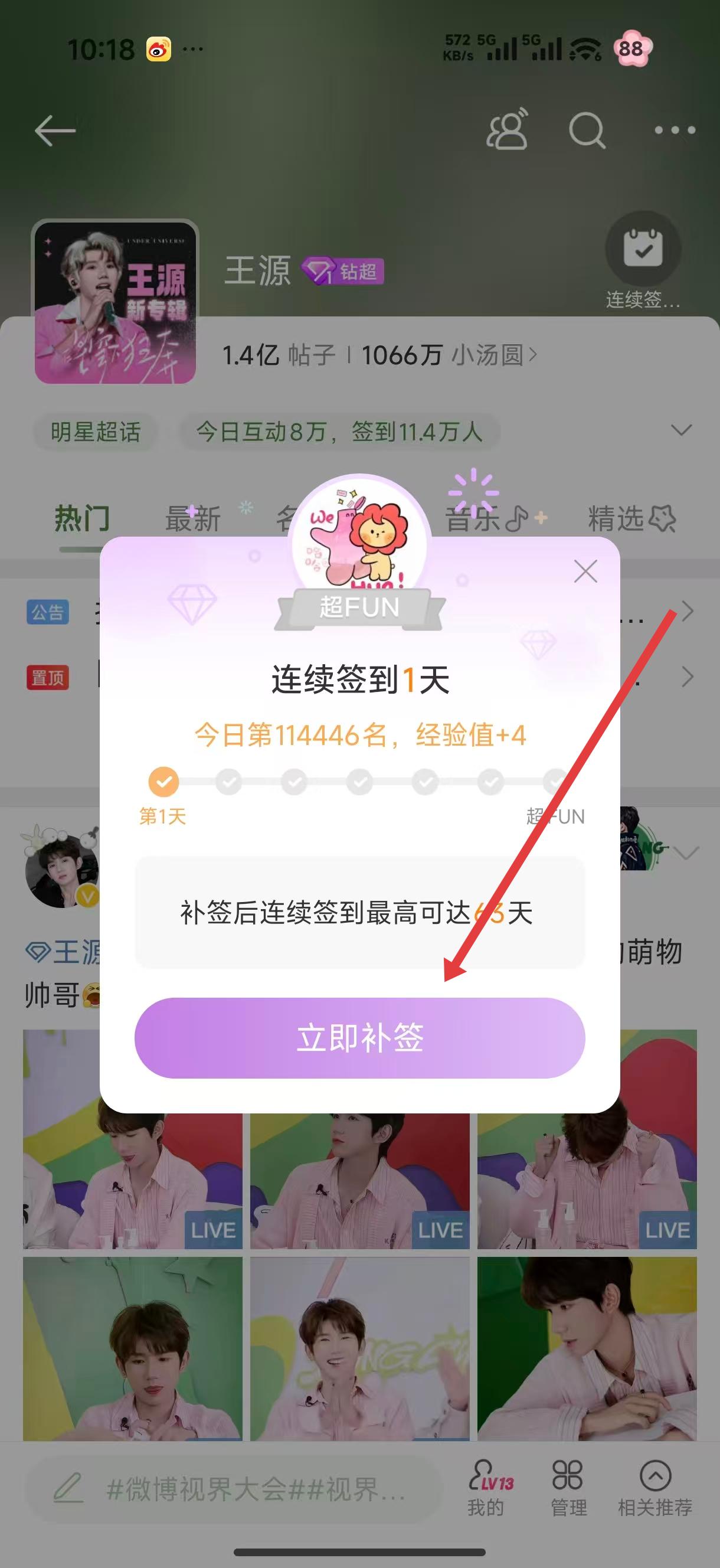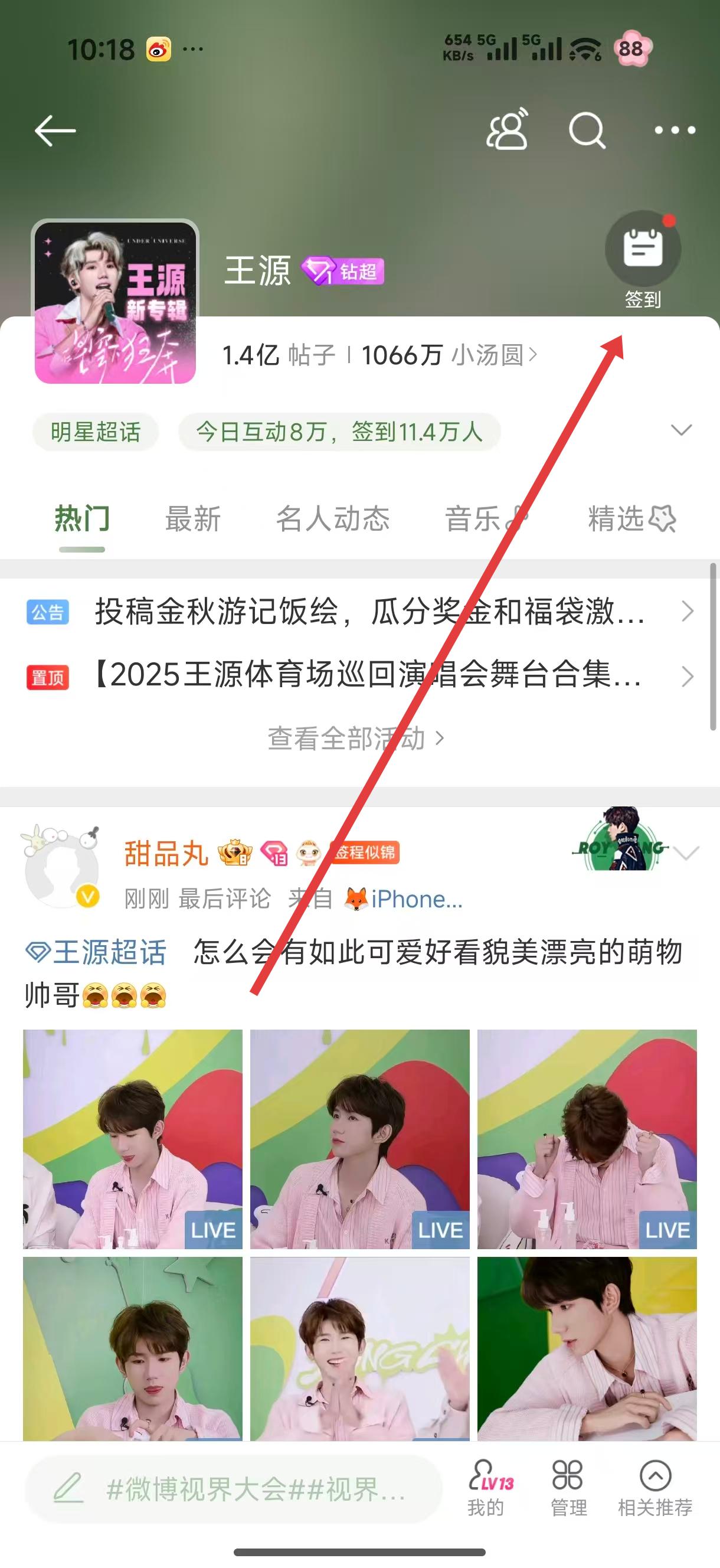 1、打開微博APP,進(jìn)入明星超話頁面,看到簽到按鈕,點擊該按鈕,完成當(dāng)日簽到操作。