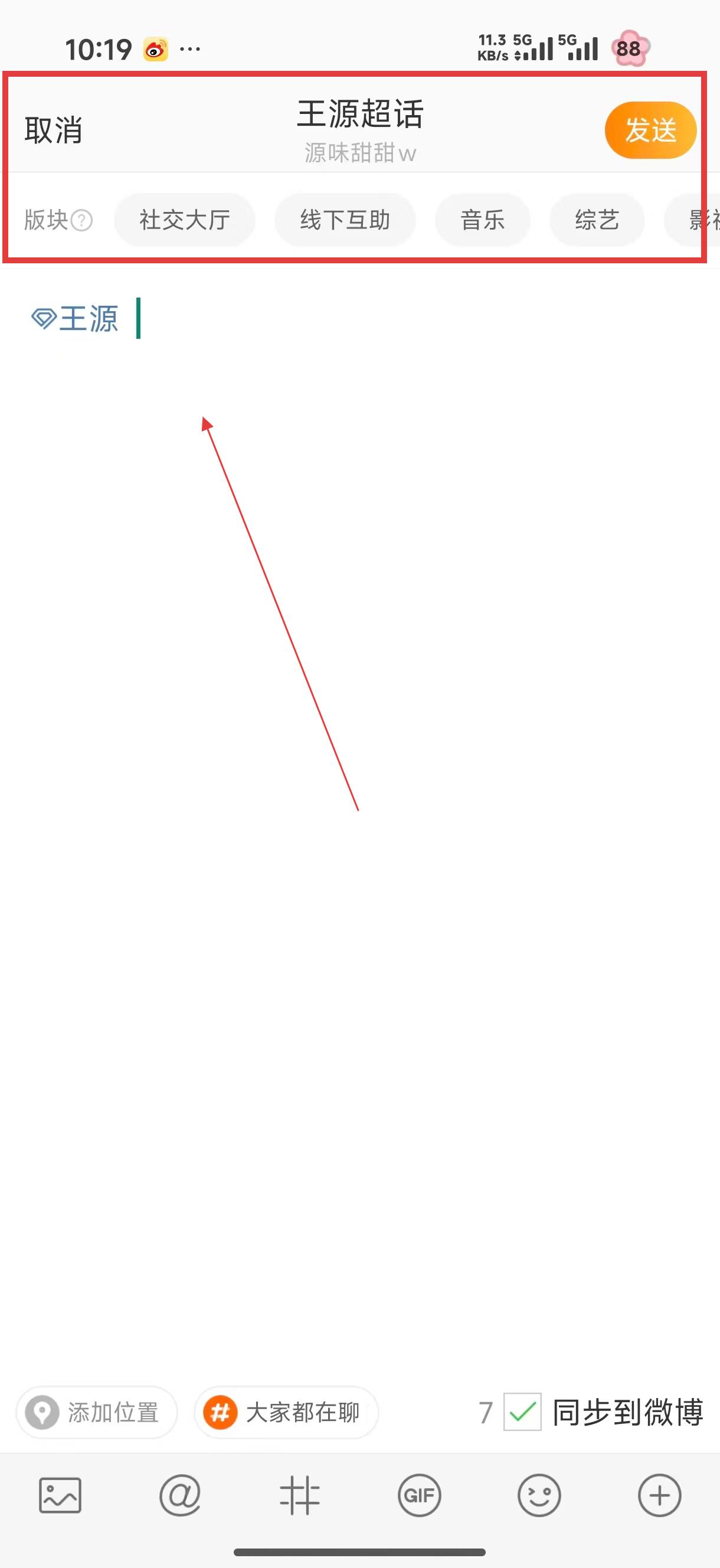 4、補(bǔ)簽完成后,進(jìn)入超話發(fā)帖頁面,輸入想要發(fā)布的內(nèi)容,點擊發(fā)送按鈕,將內(nèi)容發(fā)布到超話中。