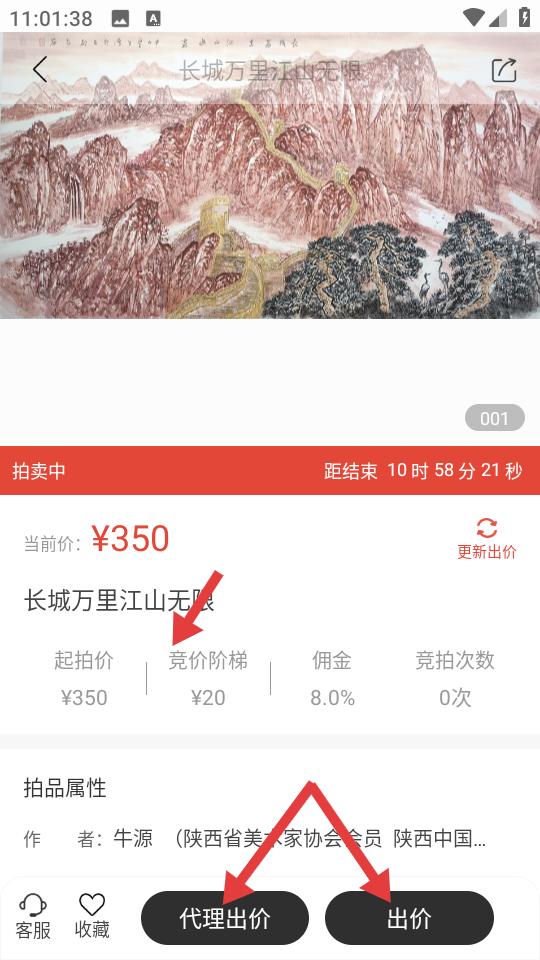 3、進(jìn)入拍品詳情頁(yè)查看長(zhǎng)城萬(wàn)里江山無(wú)限的起拍價(jià)、競(jìng)價(jià)階梯與作者信息,掌握傭金比例和競(jìng)拍次數(shù),點(diǎn)擊代理出價(jià)或出價(jià)競(jìng)拍,實(shí)時(shí)跟進(jìn)拍賣(mài)進(jìn)度。