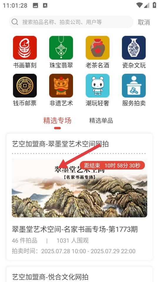2、網(wǎng)絡(luò)拍賣(mài)板塊選擇書(shū)畫(huà)篆刻等分類(lèi),查看翠墨堂藝術(shù)空間網(wǎng)拍專(zhuān)場(chǎng),了解46件拍品、千余人圍觀(guān)及拍賣(mài)時(shí)段,精準(zhǔn)定位名家書(shū)畫(huà)專(zhuān)場(chǎng)。