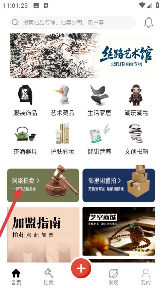 1、進(jìn)入藝空聯(lián)盟首頁(yè)瀏覽服裝飾品、藝術(shù)藏品等豐富分類(lèi),點(diǎn)擊網(wǎng)絡(luò)拍賣(mài)一鍵直達(dá)拍賣(mài)會(huì),涵蓋生活家居、潮玩潮物等多元品類(lèi)。