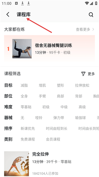 1、課程庫有熱門課程如宿舍無器械臀腿訓(xùn)練,可按減脂、增肌等目標(biāo),全身、手臂等部位,零基礎(chǔ)、初級等難度篩選,資源豐富分類細(xì)。