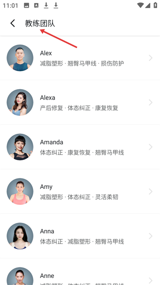 2、教練團(tuán)隊板塊有多位專業(yè)教練,如Alex擅長減脂塑形,Alexa專注產(chǎn)后修復(fù),用戶可根據(jù)需求選擇合適教練。