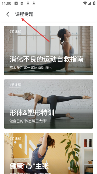 3、課程專題板塊有消化不良運(yùn)動自救指南、形體塑形特訓(xùn)等專題,涵蓋多類健身需求,助力用戶針對性提升。