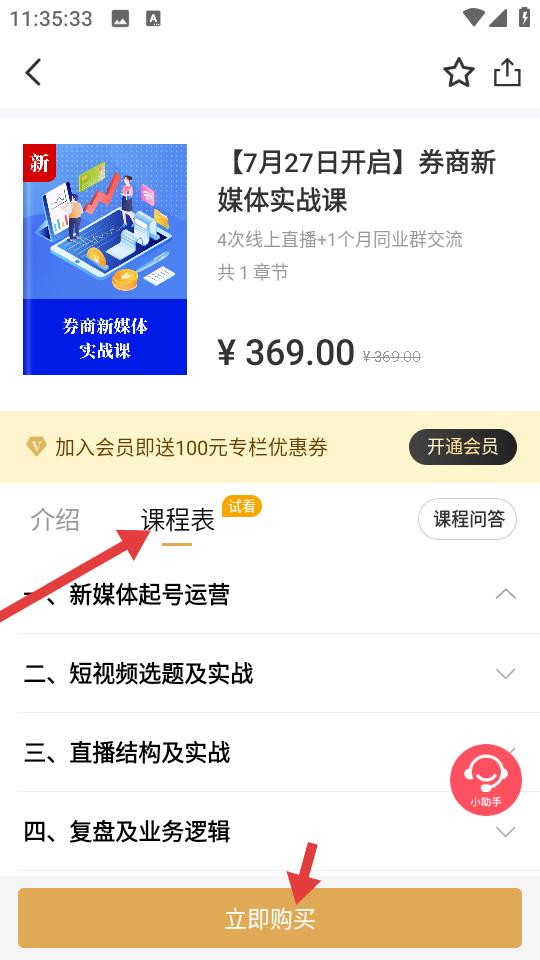 3、課程詳情頁課程表欄目清晰呈現(xiàn)新媒體起號、短視頻實戰(zhàn)等模塊,內(nèi)容體系完整,底部立即購買按鈕便捷,加入會員還可享優(yōu)惠。
