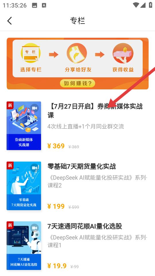 2、專欄頁面可見多樣課程陳列如券商新媒體實戰(zhàn)課標(biāo)注7月27日開啟,包含4次直播和1個月同業(yè)交流,價格清晰展示,滿足不同學(xué)習(xí)需求。