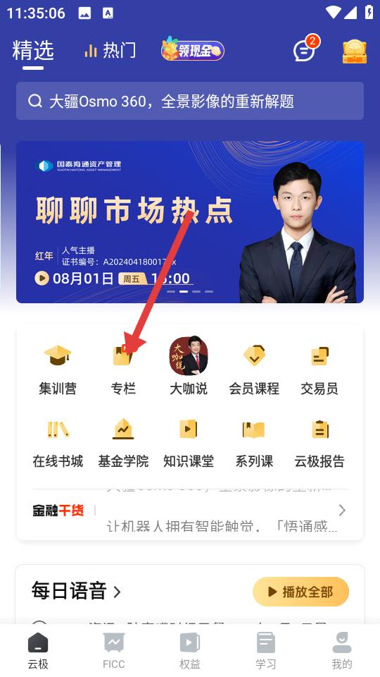 1、頂部展示直播等內(nèi)容中間功能區(qū)里專欄入口醒目,與集訓(xùn)營、大咖說等并列,匯聚各類金融專業(yè)課程,為從業(yè)者提供系統(tǒng)學(xué)習(xí)資源。