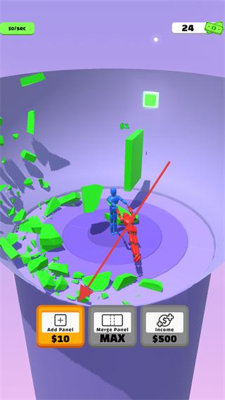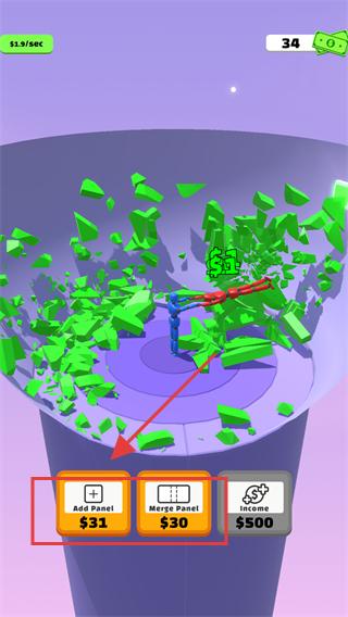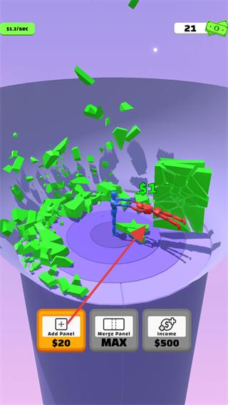 4、也可點(diǎn)擊MergeHand按鈕,對(duì)角色的攻擊部位進(jìn)行合并升級(jí),讓角色擁有更強(qiáng)的擊碎方塊能力,更高效地獲取金幣推進(jìn)游戲進(jìn)程。