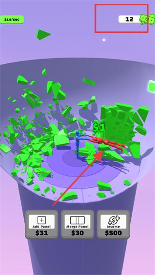 2、在擊碎方塊的過(guò)程中留意界面上方的金幣數(shù)量變化,同時(shí)觀察下方的功能按鈕,根據(jù)金幣積累情況,考慮是否使用功能按鈕。