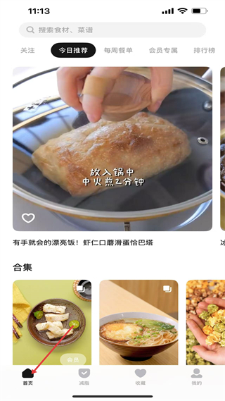 1、首頁推薦今日菜譜、合集內(nèi)容,可搜索食材菜譜,滿足美食制作與瀏覽需求,助力用戶發(fā)現(xiàn)多樣美味。