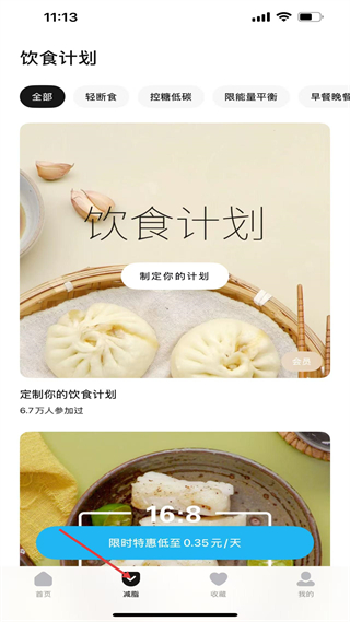 2、減脂板塊有飲食計劃功能,涵蓋輕斷食、控糖低碳等分類,助力用戶定制專屬減脂飲食,科學管理體重。