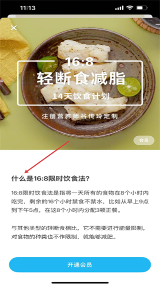 4、輕斷食減脂板塊介紹16:8限時飲食法,由注冊營養(yǎng)師定制14天飲食計劃,幫助用戶科學高效減脂。