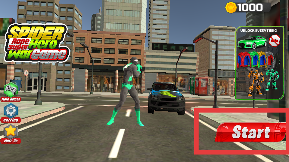1、玩家下載游戲之后,在游戲初始界面點(diǎn)擊Start按鈕,進(jìn)入游戲的主場(chǎng)景,準(zhǔn)備開始扮演蜘蛛繩超級(jí)英雄執(zhí)行任務(wù)。
