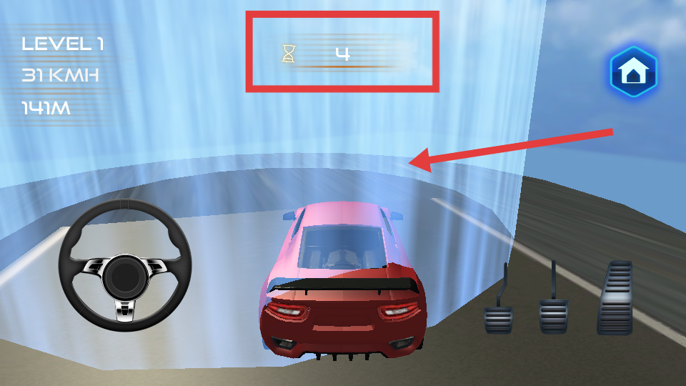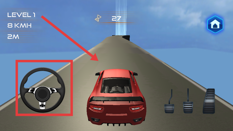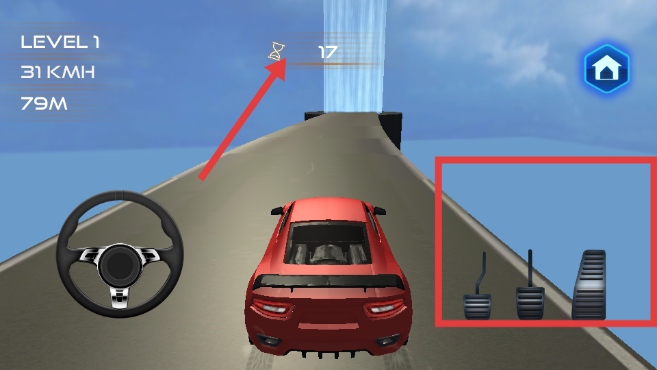 2、進入游戲后通過屏幕左側(cè)的方向盤虛擬按鍵控制車輛的行駛方向,右側(cè)的踏板按鍵控制車輛的加速與減速,在賽道上平穩(wěn)或快速行駛。