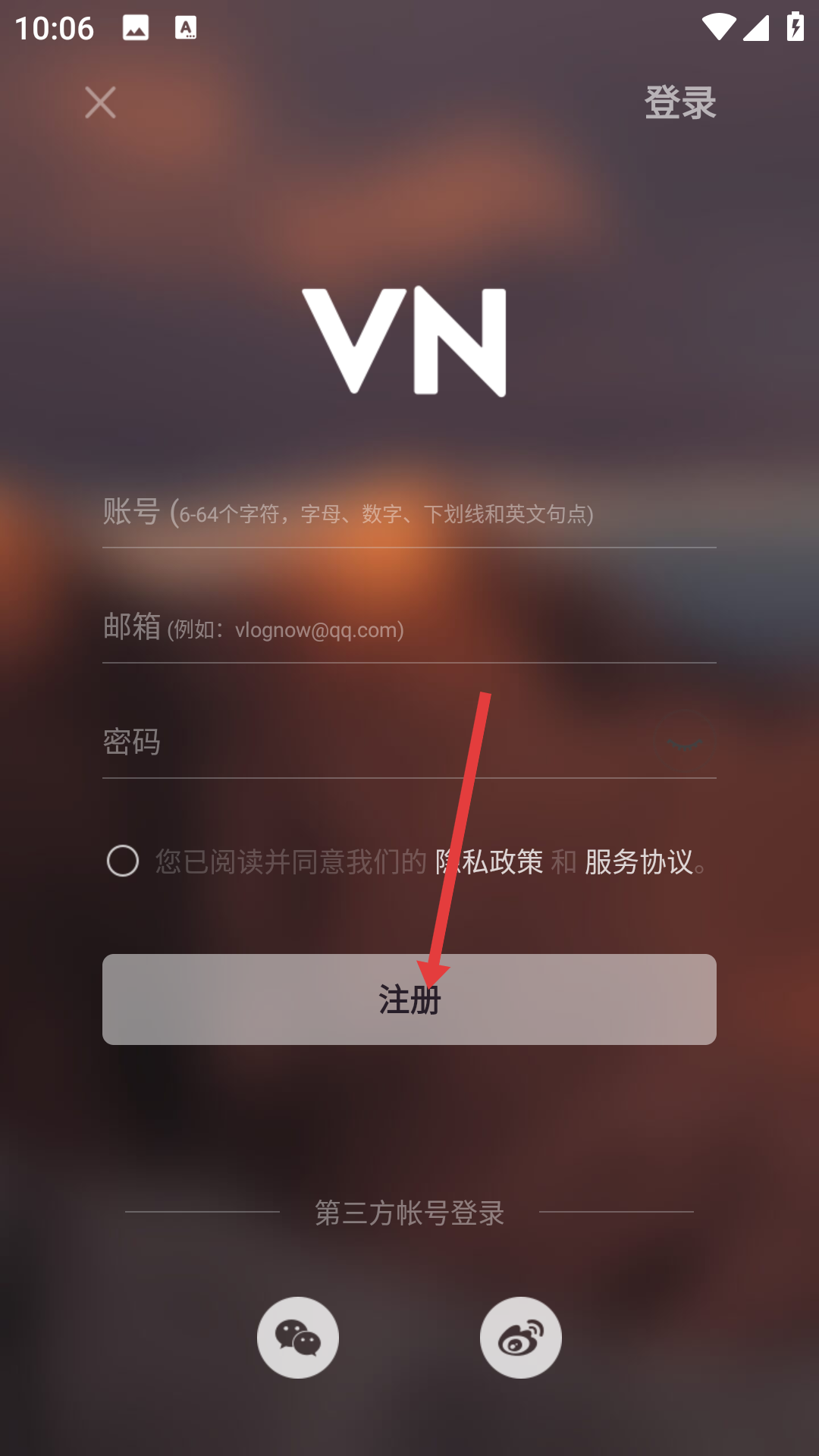 3、在注冊信息填寫頁面,按要求填寫賬號、郵箱、密碼,點(diǎn)擊下方的注冊按鈕,即可完成vn視跡簿賬號的注冊操作,之后就能正常使用軟件功能。