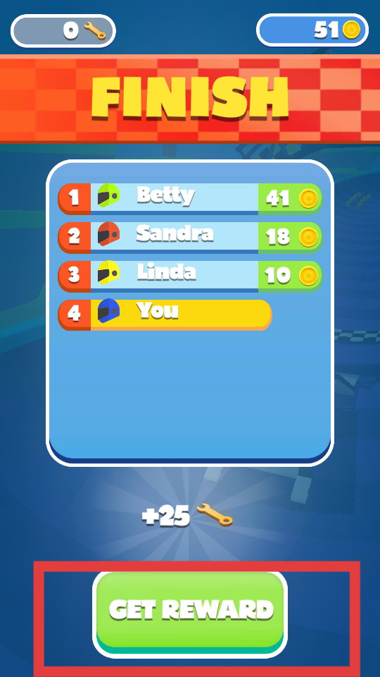 4、完成競賽關卡后,會顯示競賽排名和獎勵情況,點擊GET REWARD按鈕,領取競賽獲得的金幣、扳手等獎勵。