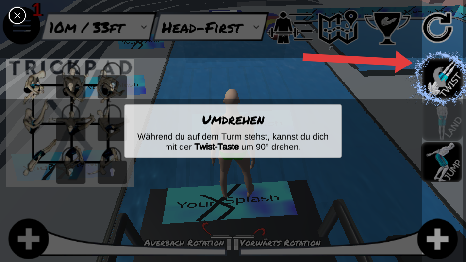2、在跳臺場景,根據(jù)提示,利用TWIST按鈕,在站在跳臺上時,可讓角色旋轉(zhuǎn)90度,為跳水做準備。