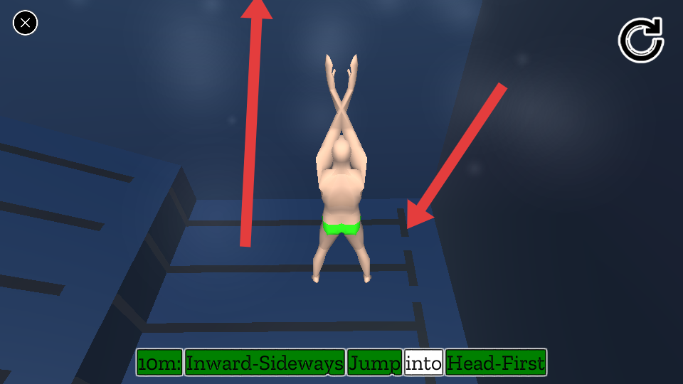 3、按照箭頭指示方向,操控角色進行一系列跳水動作,從跳臺躍入水中,完成跳水動作。