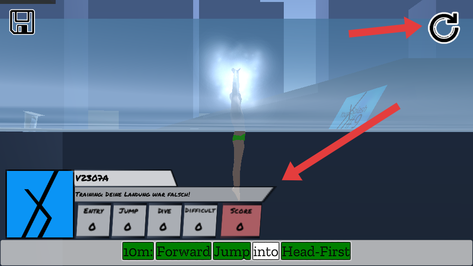 4、若跳水著陸錯誤,界面會提示你的著陸是錯誤的,此時可點擊右上角重玩按鈕,重新嘗試跳水動作。