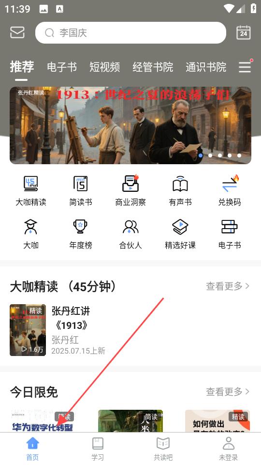 1、首頁界面,有搜索框可搜索內(nèi)容,還有大咖精讀、簡讀書等多個功能入口,以及大咖精讀和今日限免板塊。