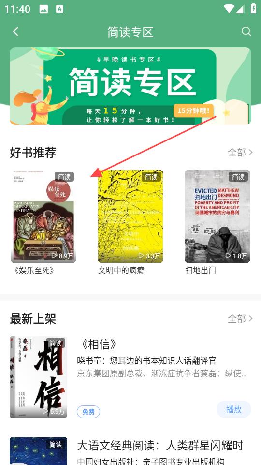 2、簡讀專區(qū)界面,有好書推薦和最新上架板塊,展示了娛樂至死等多本簡讀書籍,用戶可點(diǎn)擊查看全部或進(jìn)行播放,方便用戶利用碎片化時間輕松了解好書內(nèi)容。