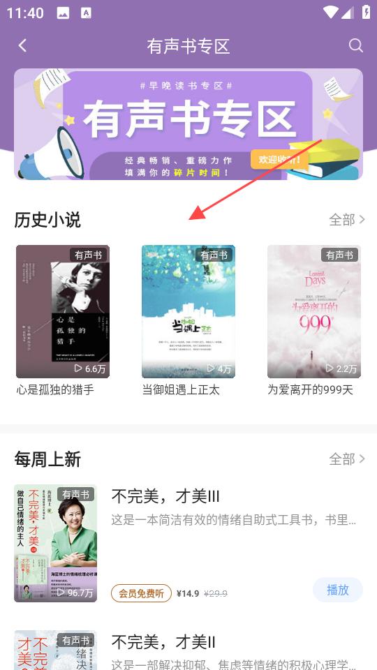 3、有聲書專區(qū)界面,有歷史小說和每周上新板塊,用戶可點(diǎn)擊查看全部或進(jìn)行播放,足用戶在碎片時間收聽經(jīng)典暢銷書籍的需求。