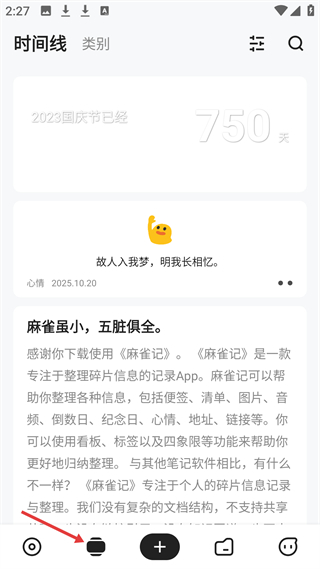 1、麻雀記時(shí)間線頁(yè),可記錄心情等碎片信息,能看到距2023年國(guó)慶節(jié)天數(shù),還有相關(guān)文字內(nèi)容,助力碎片信息整理。