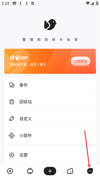 4、功能頁(yè)有備份、回收站等功能,麻雀VIP能解鎖更豐富自定義,還有小部件、設(shè)置等,方便信息管理與個(gè)性化設(shè)置。