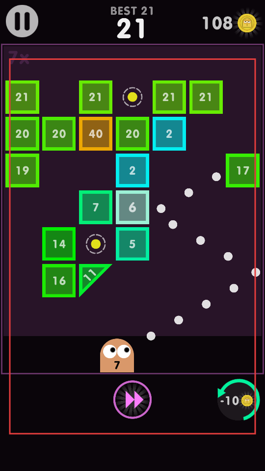 2、通過(guò)滑動(dòng)等操作控制發(fā)射方向,讓角色發(fā)射小球,瞄準(zhǔn)帶有數(shù)字的磚塊,撞擊消除它們,積累分?jǐn)?shù)。
